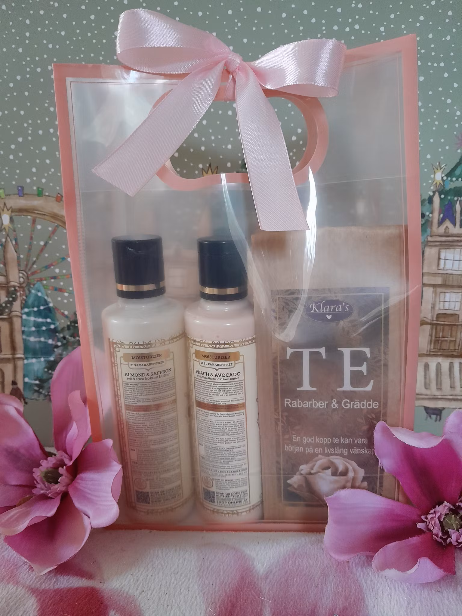 lotions från Khadi natural mandel o saffran samt persika samt rabarbergrädd Te från Klaras goda presenter.