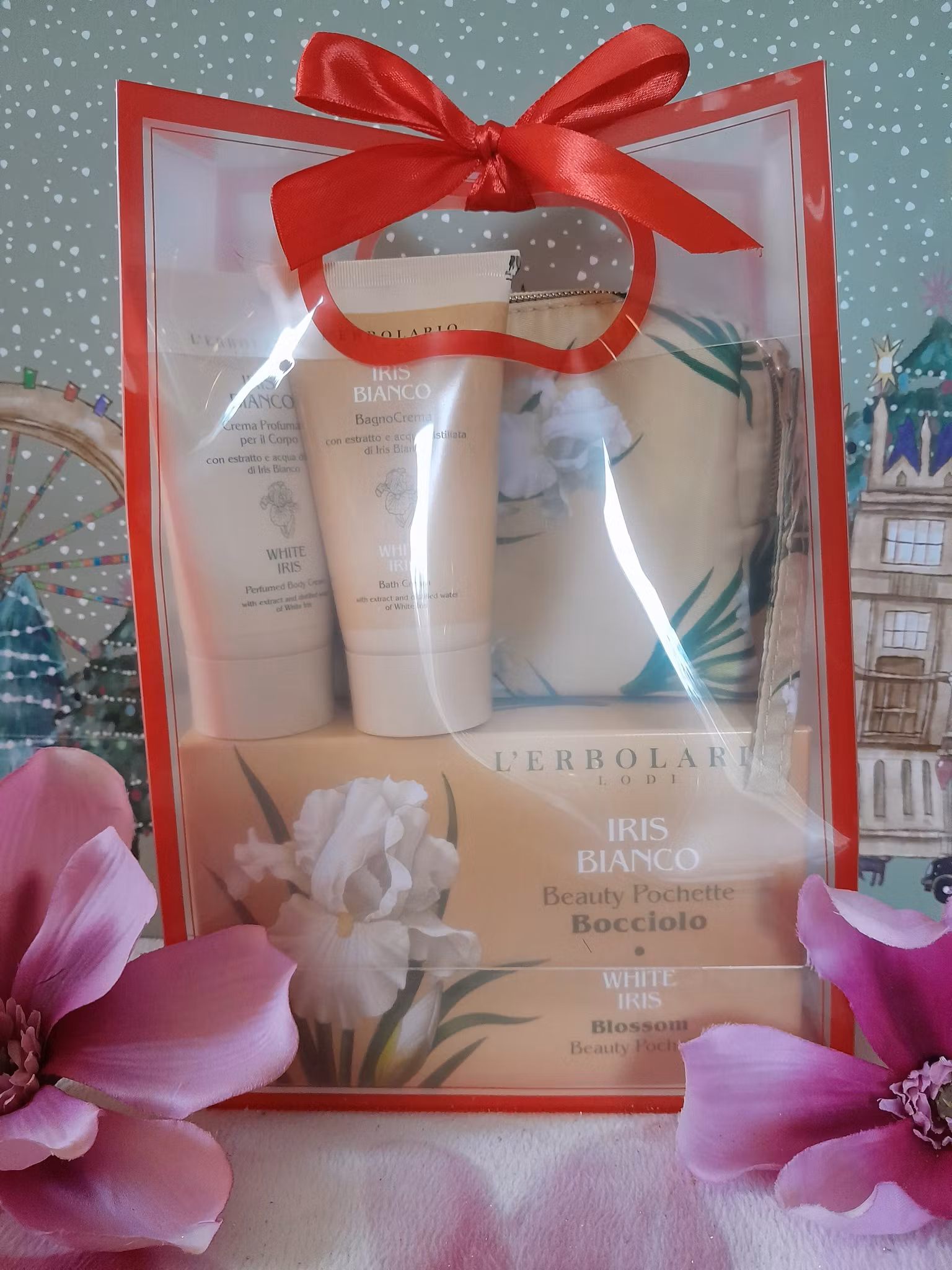 Söt liten necessär med duschkräm o kroppskräm vit iris från Lerbolario I presentpåse.